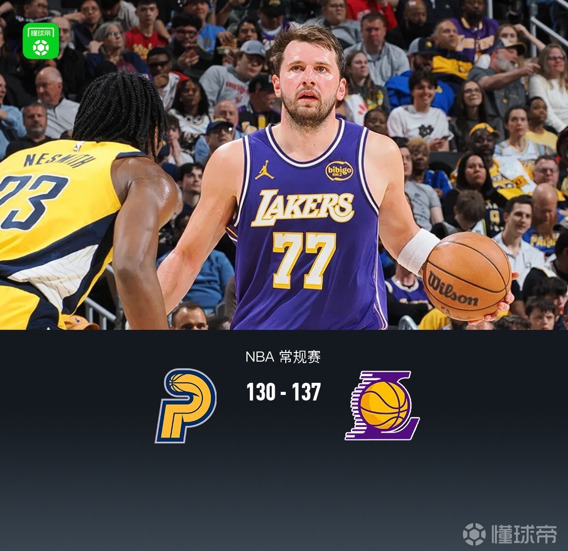 北京時(shí)間3月26日NBA 常規(guī)賽,印第安納步行者對(duì)陣洛杉磯湖人。首節(jié)湖人東契奇21分帶隊(duì)45-28領(lǐng)先17分,半場(chǎng)步行者59-75湖人,三節(jié)湖人最大領(lǐng)先29分,三節(jié)結(jié)束仍領(lǐng)先20分,末節(jié)步行者反撲一度追至6分,最終湖人137-130步行者。