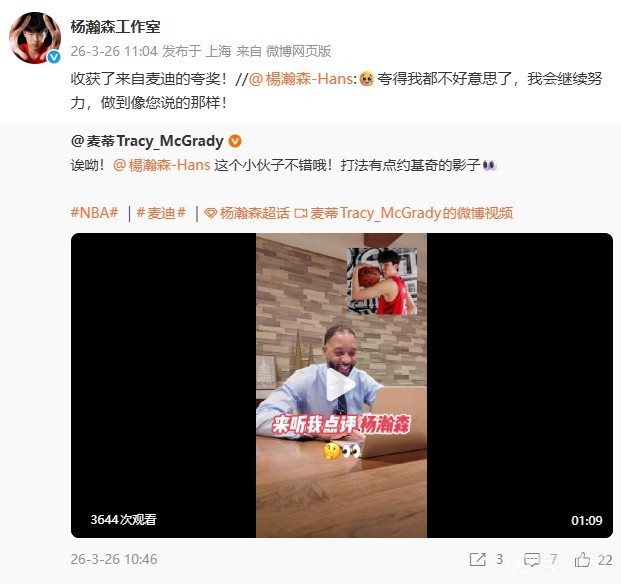 北京時(shí)間3月26日,NBA名宿、前火箭球星麥迪更新中文社媒,盛贊楊瀚森NBA生涯至今的表現(xiàn),并對(duì)楊瀚森的前景充滿期待。